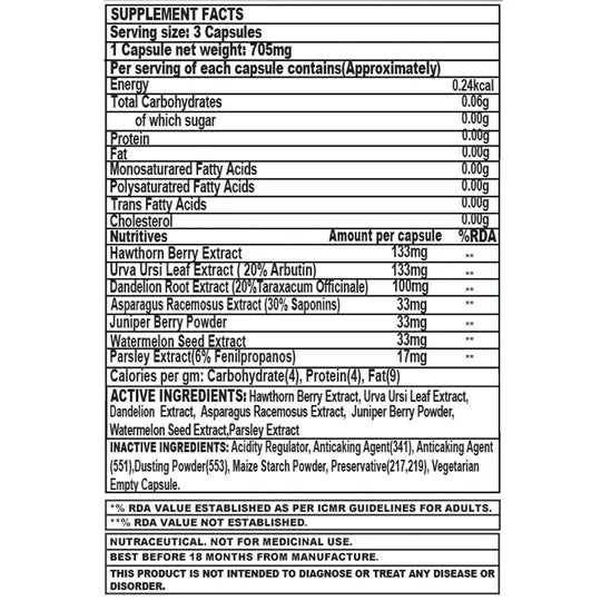 - Gentle and Natural Detox: Enhance your detox efforts with the gentle yet effective diuretic properties of our capsules, helping your body flush out toxins.