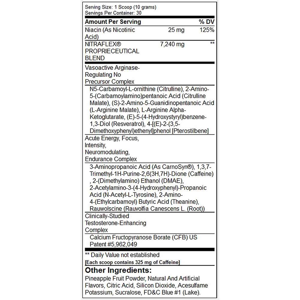 - Caffeine Anhydrous: This potent form of caffeine increases metabolism and energy levels, giving you the boost you need to power through your toughest workouts. NITRAFLEX ADVANCED contains 325mg of Caffeine Anhydrous per serving.