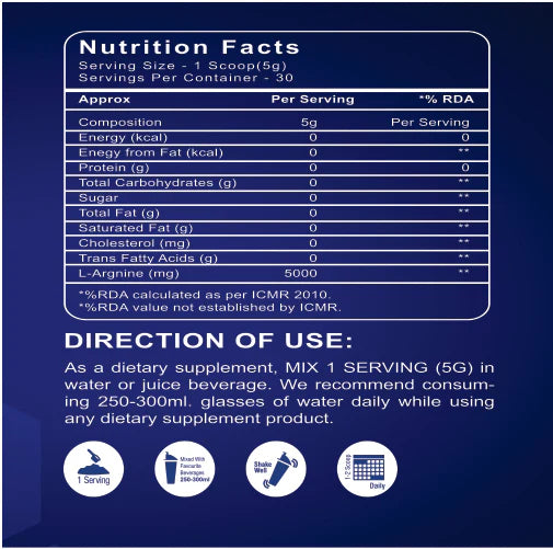 Muscle Performance L-Arginine contains 5g of fast absorbing Arginine Preworkout Amino Acid in each serving for rapid absorption rate with faster results in building strength and endurance. L-Arginine is an essential amino acid that helps promote healthy circulation. This means more oxygen reaches your Muscles, Brain, Heart, Lungs, and other organs. More blood flow means more muscle gains. L-Arginine also supports energy levels, which makes it perfect for weightlifters, runners, and everyday active people. It also helps maintain good blood sugar levels and provides support for a healthy immune system. Banned Substance Free : Athletes can be assured it has undergone rigorous checks and testing to ensure that it is not contaminated with any banned substances and is safe to use. Muscle Performance L-Arginine . Add 200-250ml of cold water to a shaker or a glass and add 1 scoop of powder (4g approx.), Blend well until it is completely mixed and consume immediately.
