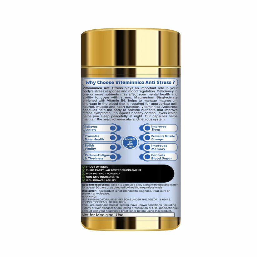 Vitaminnica Anti-Stress capsules plays an important role in your body’s stress response and mood regulation. Deficiency in one or more nutrients may affect your mental health and ability to cope with stress. Magnesium Bisglycinate enriched with Anti Stress Reliever Vitamin B6, helps to manage magnesium shortage in the blood that is required for appropriate cell, neuron, muscle and heart function. It help the body to provide nutrients that improve stress symptoms. Vitaminnica Antistress capsules supports healthy cortisol levels which helps you sleep peacefully at night. It helps maintain the health of muscular and nervous system.