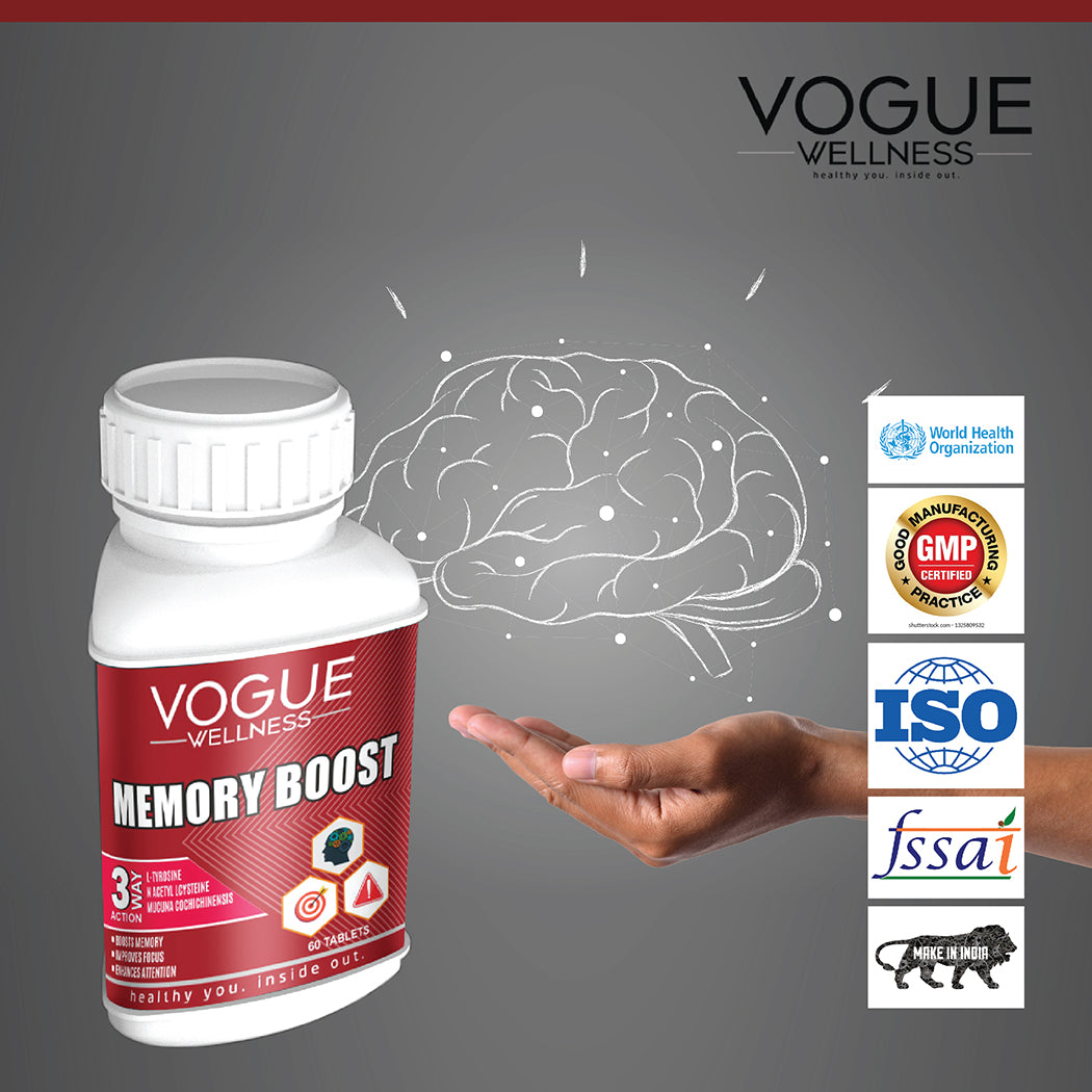 Vogue Wellness Memory Boost Capsules are a blend of ingredients like Ginkgo Biloba and Brahmi that may help reduce stress, boost memory, improve focus, and enhance attention. These capsules also support brain function and cognitive capabilities.